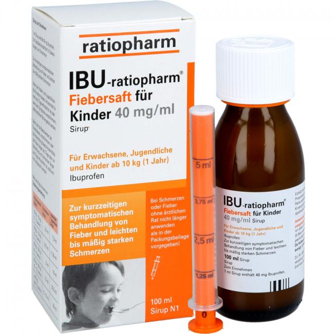 IBU-ratiopharm Fiebersaft für Kinder 40 mg/ml ist ein weißer bis leicht gelblicher, trüber Sirup. IBU-ratiopharm Fiebersaft für Kinder 40 mg/ml ist in Packungen mit je 100 ml Sirup erhältlich, eine 5 ml Applikationsspritze für Zubereitungen zum Einnehmen liegt bei.