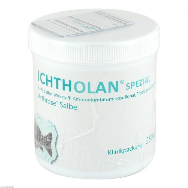 Ichtholan Spezial 85%. Wirkstoff: Ammoniumbituminosulfonat (Ichthyol) Trockenrückstand 62%. Anwendungsgebiete: zur Kurzzeitanwendung (max. 9 Tage): zur Behandlung von Belastungsschmerzen bei Kniegelenksarthrose.