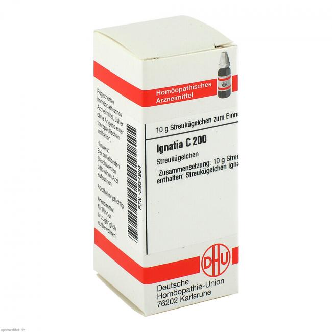 Ignatia C 200. Anwendungsgebiete: Registriertes homöopathisches Arzneimittel, daher ohne Angabe einer therapeutischen Indikation. Warnhinweis: Dieses Arzneimittel enthält Sucrose (Saccharose / Zucker).
