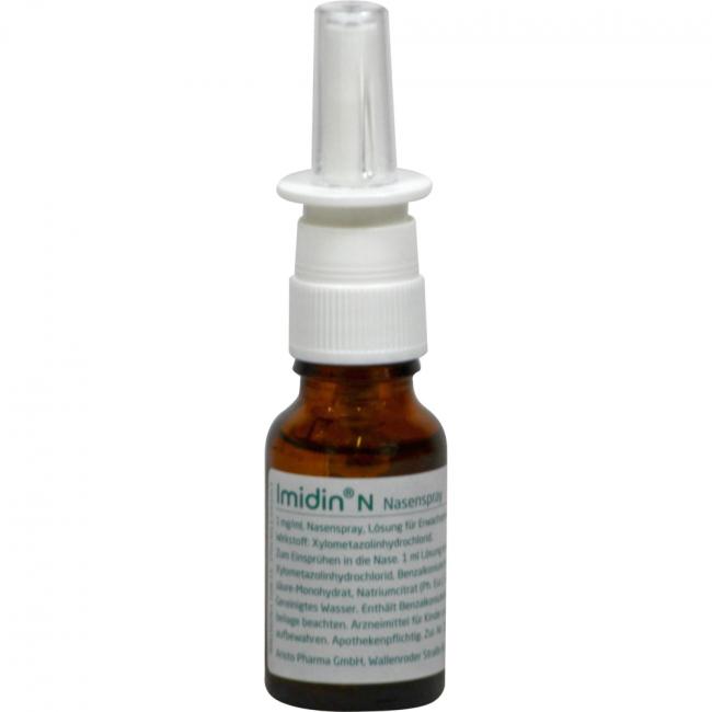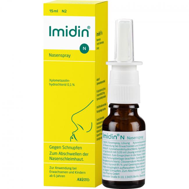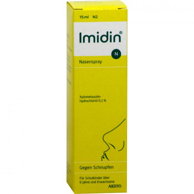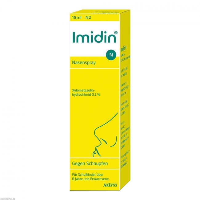 Imidin N Nasenspray 1 mg/ml, Lösung. Wirkstoff: Xylometazolinhydrochlorid. Anwendungsgebiete: zur Abschwellung der Nasenschleimhaut bei Schnupfen, anfallsweise auftretendem Fließschnupfen (Rhinitis vasomotorica), allergischem Schnupfen (Rhinitis allergica).