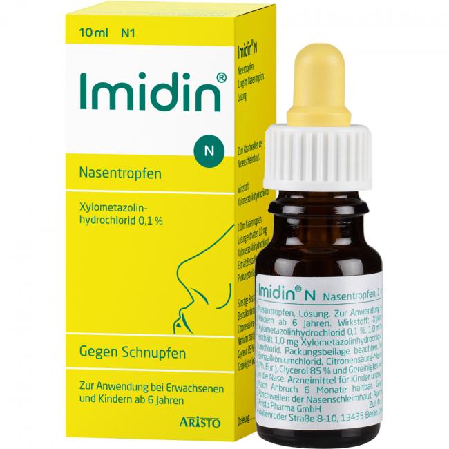 Imidin N Nasentropfen sind ein Mittel zur Anwendung in der Nase (Rhinologikum) und enthalten das Alpha-Sympathomimetikum Xylometazolin. Xylometazolin hat gefäßverengende Eigenschaften und bewirkt dadurch eine Schleimhautabschwellung. Imidin N Nasentropfen werden angewendet zur Abschwellung der Nasenschleimhaut bei Schnupfen, anfallsweise auftretendem Fließschnupfen (Rhinitis vasomotorica), allergischem Schnupfen (Rhinitis allergica). Imidin N Nasentropfen ist für Schulkinder über 6 Jahre und Erwachsene geeignet. Es darf nicht bei Kindern der Altersgruppe unter 6 Jahren angewendet werden. Wenn Sie sich nach 7 Tagen nicht besser oder gar schlechter fühlen, wenden Sie sich an Ihren Arzt.