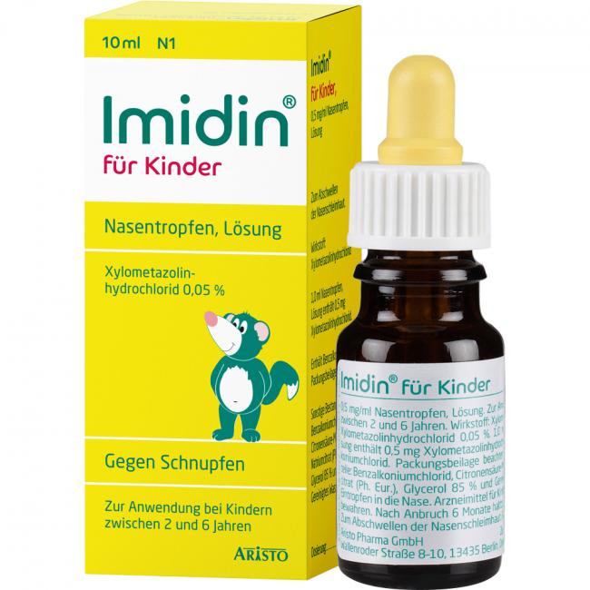 Imidin für Kinder Nasentropfen. Wirkstoff: Xylometazolinhydrochlorid. Anwendungsgebiete: zur Abschwellung der Nasenschleimhaut bei Schnupfen, anfallsweise auftretendem Fließschnupfen (Rhinitis vasomotorica), allergischem Schnupfen (Rhinitis allergica).