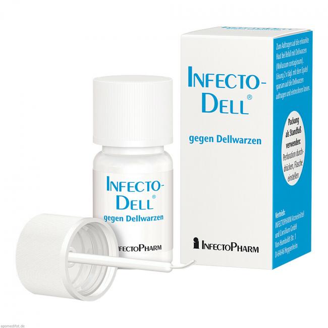 InfectoDell, Lösung. Wirkstoff: Kaliumhydroxid. Anwendungsgebiete: äußerlich bei Befall mit Dellwarzen (Molluscum contagiosum).