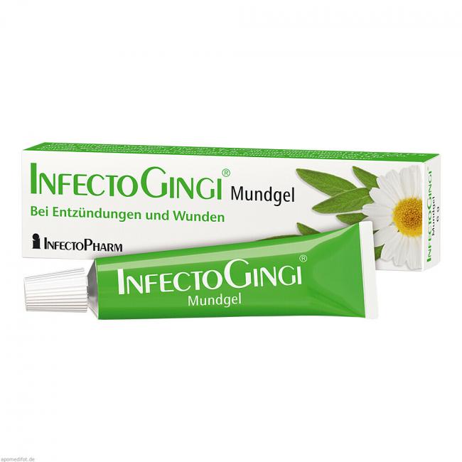 Infectogingi Mundgel. Anwendungsgebiete: zur zeitweiligen unterstützenden Behandlung von Entzündungen und Wunden der Mundschleimhaut und des Zahnfleisches. Warnhinweis: Enthält Propylenglycol.