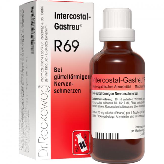 Intercostal-Gastreu R 69, Mischung flüssiger Verdünnungen zum Einnehmen, die Anwendungsgebiete leiten sich von den homöopathischen Arzneimittelbildern ab. Dazu gehören: Gürtelförmige Nervenschmerzen entlang eines oder mehrerer Zwischenrippenräume, zur Anwendung bei Kindern über 12 Jahren sowie Erwachsenen