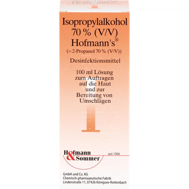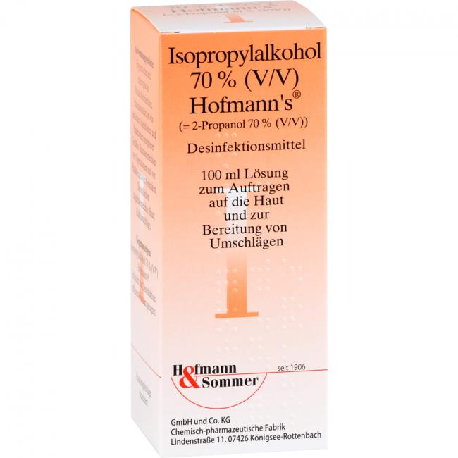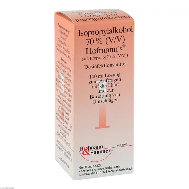 Isopropylalkohol 70 % (V/V) Hofmann's. Anwendungsgebiete: Desinfektionsmittel zur hygienischen und chirurgischen Händedesinfektion, Hautdesinfektion vor einfachen Injektionen und Punktionen peripherer Gefäße, Hautdesinfektion vor Operationen und vor Punktionen von Gelenken, Desinfektion talgdrüsenreicher Haut und zur Bereitung von Kühlumschlägen.