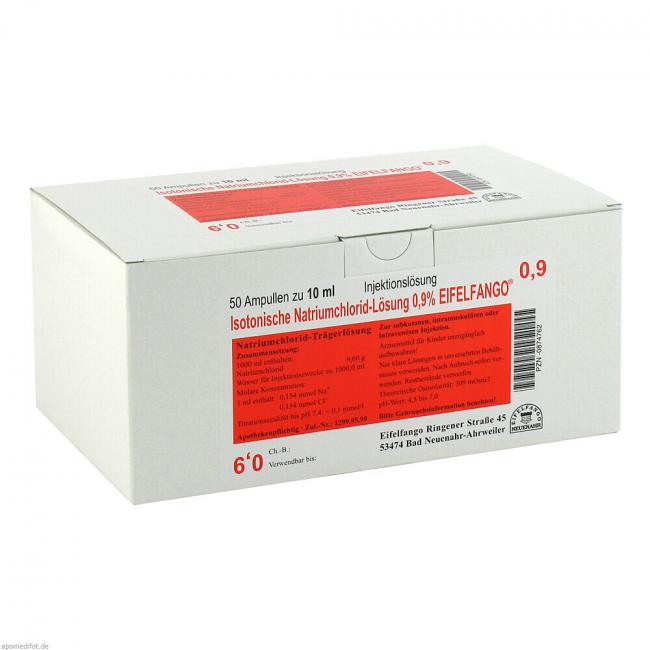 Isotonische Natriumchlorid-Lösung 0,9% Eifelfango, Infusionslösung. Anwendungsgebiete: Flüssigkeits- und Elektrolytsubstitution bei hypochlorämischer Alkalose; Chloridverluste; kurzfristiger intravasaler Volumenersatz; hypotone Dehydratation; isotone Dehydratation.