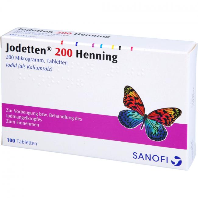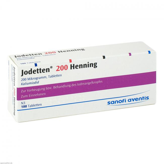 Jodetten 200 Henning sind ein Schilddrüsenmedikament. Es enthält als Wirkstoff Kaliumiodid und wird zur Kropfbehandlung und gleichzeitigen Ergänzung des Iodbedarfs angewendet.