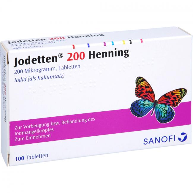 Jodetten 200 Henning 200 Mikrogramm, Tabletten Wirkstoff: Kaliumiodid Anwendungsgebiete: zur Vorbeugung eines Iodmangels (z. B. zur Vorbeugung eines Kropfes in Iodmangelgebieten und nach Entfernung eines Iodmangelkropfes), zur Behandlung eines Kropfes (diffuse euthyreote Struma) bei Neugeborenen, Kindern, Jugendlichen und jüngeren Erwachsenen.