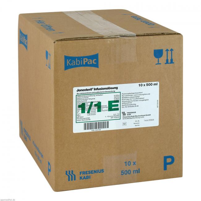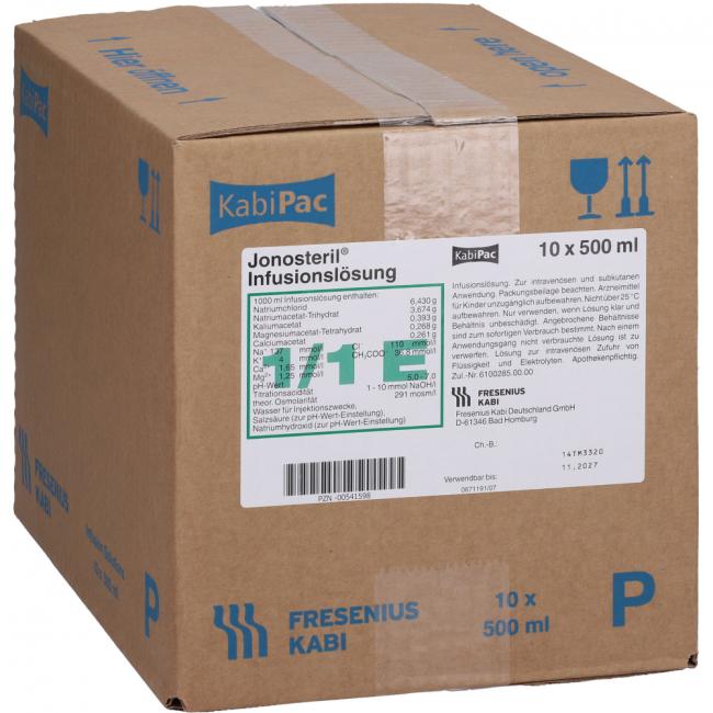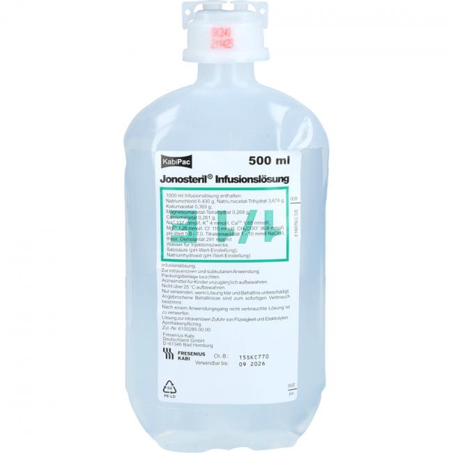 Jonosteril Infusionslösung. Anwendungsgebiete: Flüssigkeits- und Elektrolytersatz bei ausgeglichenem Säuren-Basen-Haus-halt und bei bestehender oder drohender Acidose; kurzfristiger, intravasaler Volumenersatz; isotone Dehydratation; hypotone Dehydratation. Jonosteril wird angewendet bei Erwachsenen, Neugeborenen, Kleinkindern, Kindern und Jugendlichen.