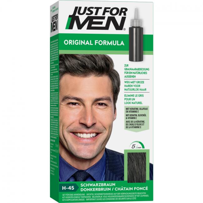 Graue Haare weg und ein natürliches Aussehen in nur 5 Minuten. JUST FOR MEN wirkt nur auf grauen Haaren und deckt sie mit Tönen ab, die der natürlichen Haarfarbe gleichen.