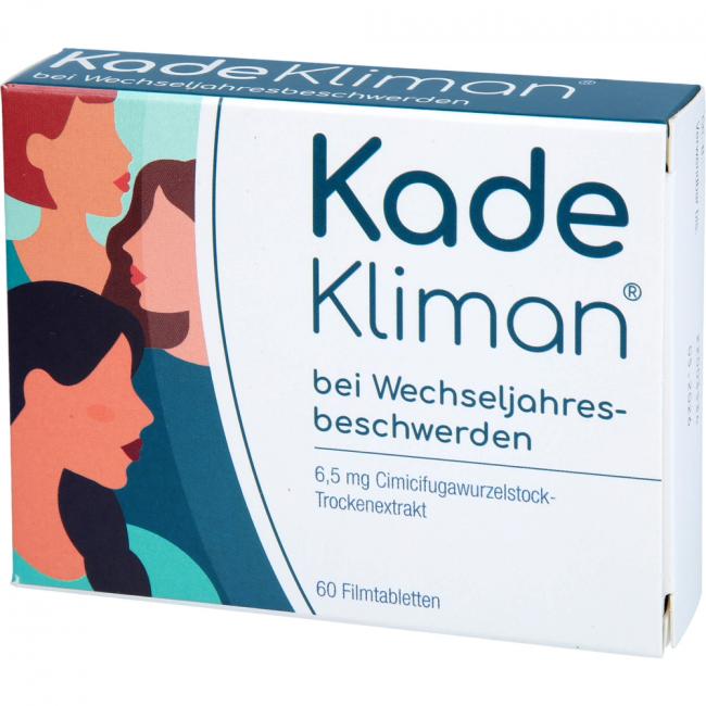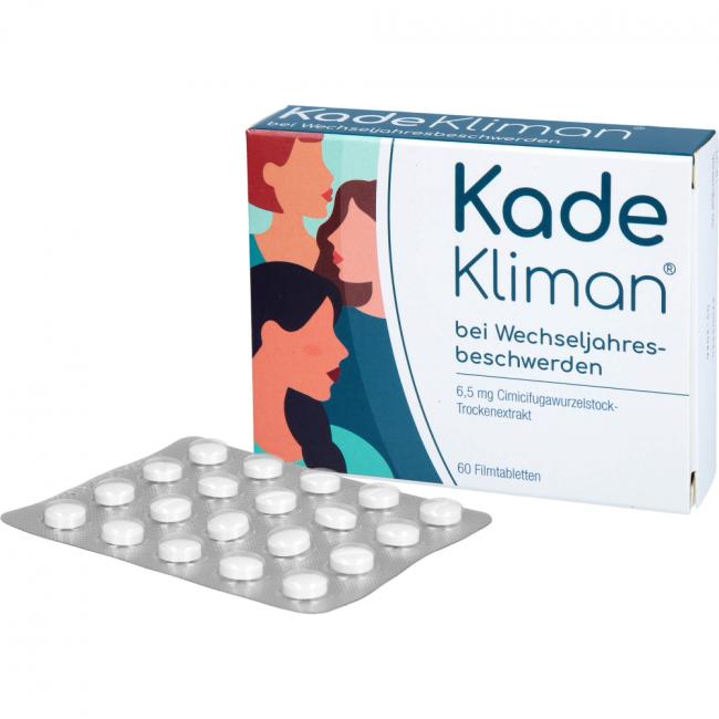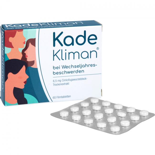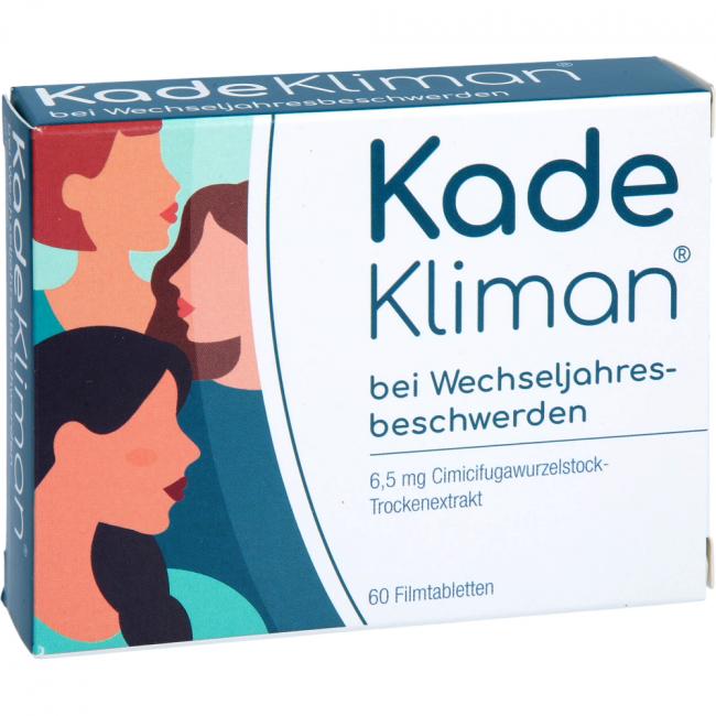 KadeKliman 6,5 mg Filmtabletten. Wirkstoff: Cimicifugawurzelstock-Trockenextrakt. Anwendungsgebiete: Pflanzliches Arzneimittel bei Wechseljahresbeschwerden, angewendet zur Besserung von psychischen und neurovegetativen Beschwerden, bedingt durch die Wechseljahre. Warnhinweis: Enthält Lactose.