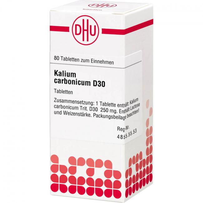 Kalium Carbonicum D 30. Anwendungsgebiete: Registriertes homöopathisches Arzneimittel daher ohne Angabe einer therapeutischen Indikation. Warnhinweis: Enthält Lactose (Milchzucker) und Weizenstärke.