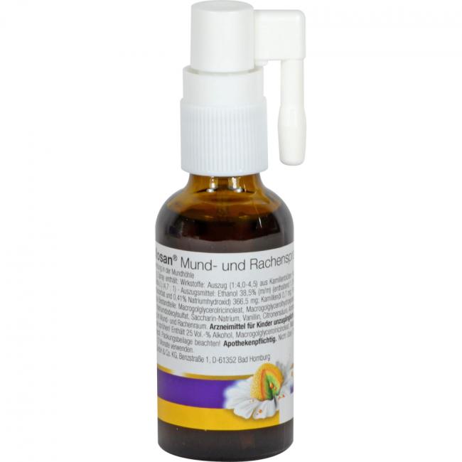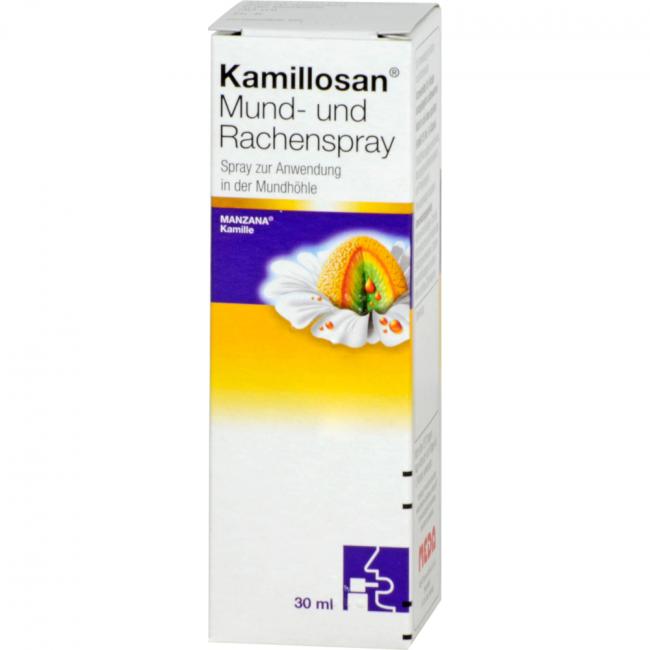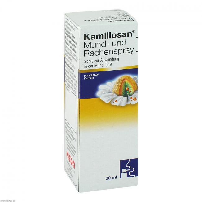 Kamillosan Mund- und Rachenspray ist ein pflanzliches Arzneimittel. Es ist ein Spray zur Anwendung in der Mundhöhle. Kamillosan Mund- und Rachenspray wird angewendet bei Rachenentzündungen (Tonsillopharyngitis) bei nicht fieberhaften Erkältungskrankheiten und bei Schleimhautentzündungen der Mundhöhle und des Zahnfleisches.