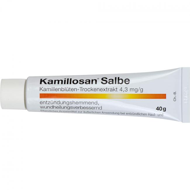 Kamillosan Salbe. Wirkstoff: Kamillenblüten-Trockenextrakt. Anwendungsgebiete: bei Haut- und Schleimhautentzündungen. Die Salbe ist auch für die Anwendung im Anal- und Genitalbereich geeignet, einschließlich für die Behandlung von Hämorrhoiden.