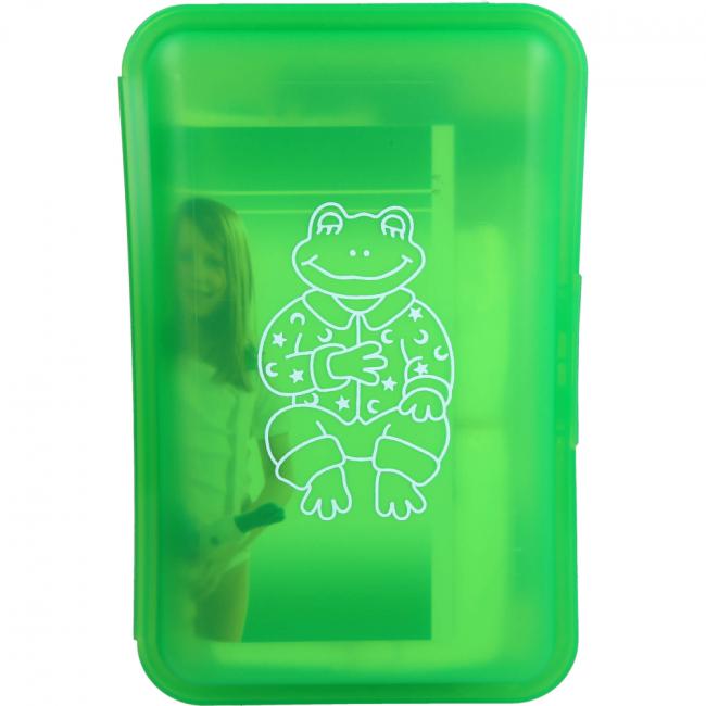 Der Plastikfrosch enthält einen Magneten, mit dem durch langsames Hin- und Herstreichen über den Signalgeber das Wecksignal abgestellt wird. Die Münze ist als Halterung für den Magnetfrosch vorgesehen. Sie wird für das Kind gut erreichbar an einen festen Platz in der Nähe der Toilette geklebt. Der Frosch darf nicht mit ans Bett genommen werden. Das Kind soll lernen aufzustehen und erst auf der Toilette das Signal abzustellen.