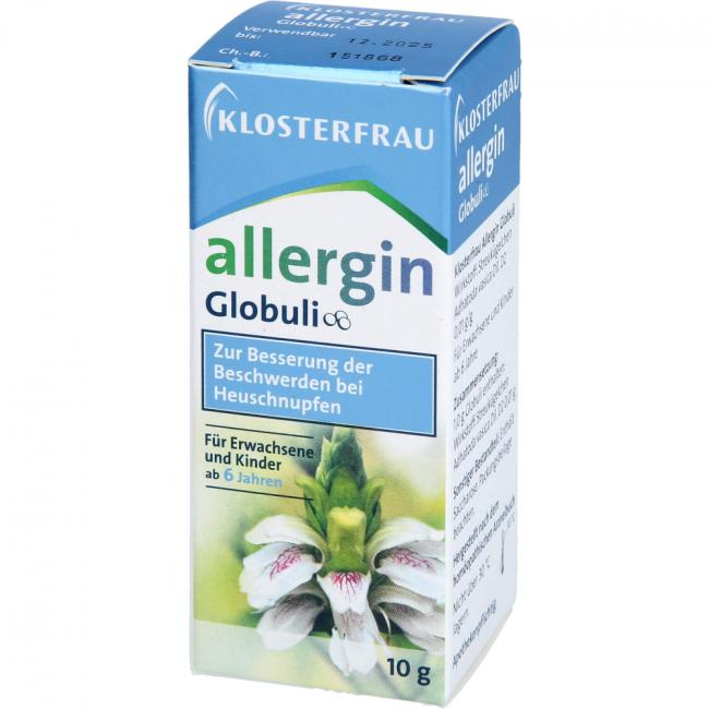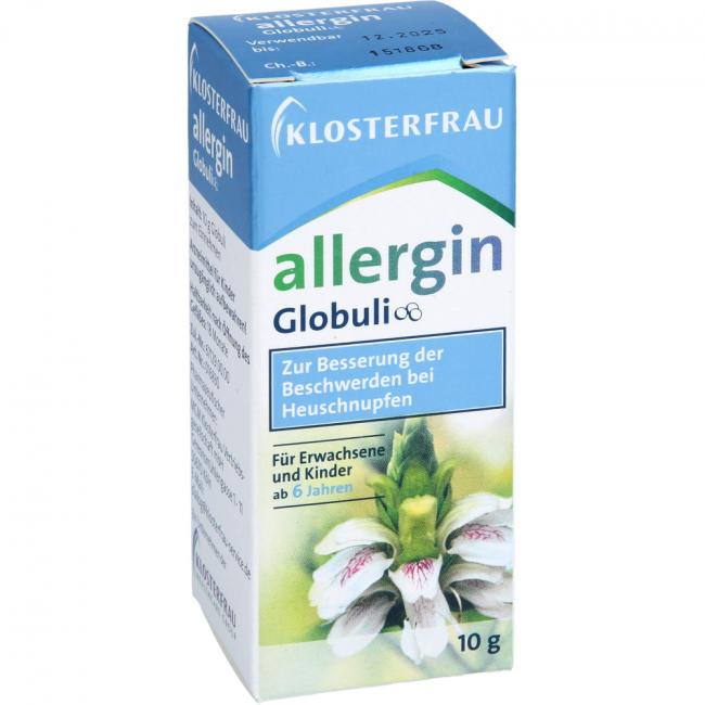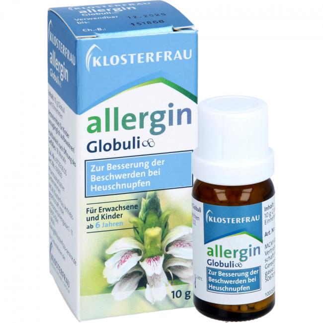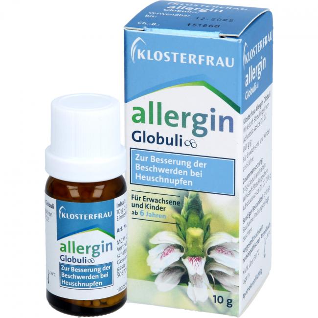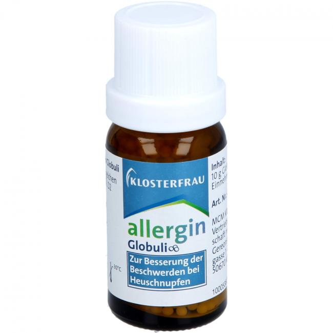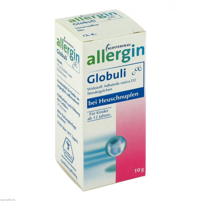 Klosterfrau Allergin Globuli. Wirkstoff: Adhatoda vasica Dil. D2. Anwendungsgebiete: Klosterfrau Allergin Globuli werden entsprechend dem homöopathischen Arzneimittelbild angewendet. Dazu gehören: Besserung der Beschwerden bei Heuschnupfen.