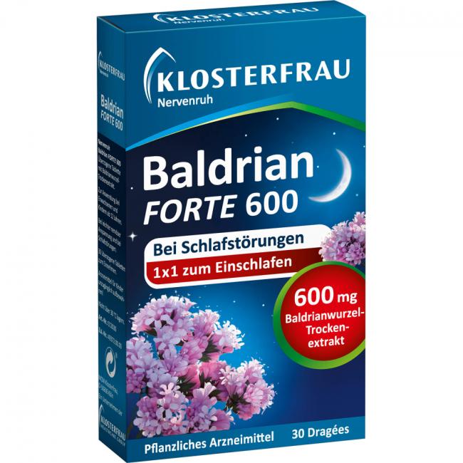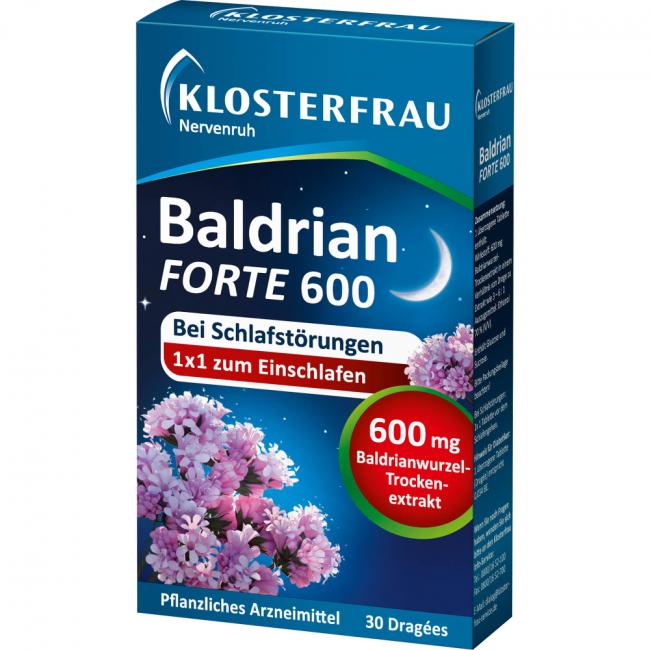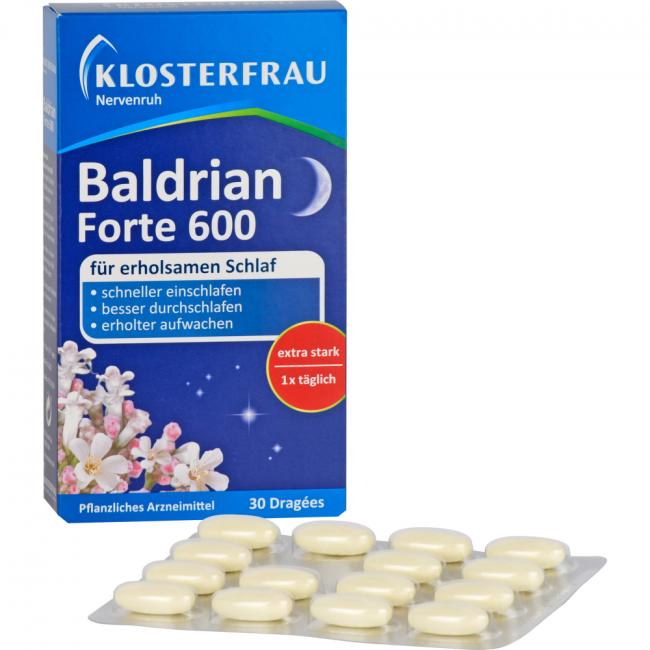 Baldrian Forte 600, überzogene Tabletten.Wirkstoff: Baldrianwurzel-Trockenextrakt. Anwendungsgebiete: bei leichter nervöser Anspannung und bei Schlafstörungen.