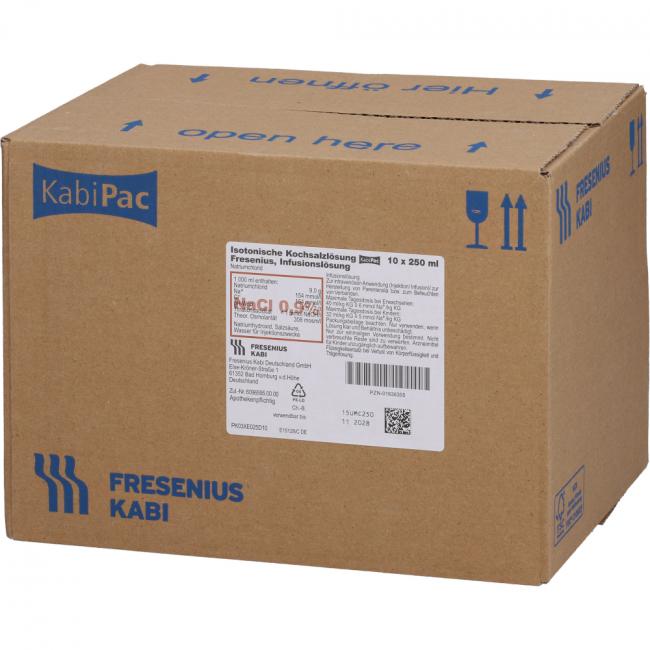 Isotonische Kochsalzlösung Fresenius, Infusionslösung. Anwendungsgebiete: Plasmaisotoner Flüssigkeitsersatz bei hypotoner und isotoner Dehydratation, kurzfristiger intravasaler Volumenersatz. Als Trägerlösung für Elektrolytkonzentrate und kompatible Medikamente. Zum Befeuchten von Verbänden.