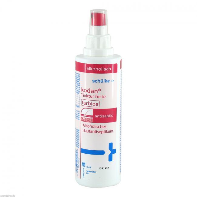 kodan Tinktur Forte farblos. Anwendungsgebiete: zur Hautdesinfektion vor operativen Eingriffen, Katheterisierungen, Blut- und Liquorentnahmen, Injektionen, Punktionen, Exzisionen, Kanülierungen, Biopsien u.a., zur Nahtversorgung, zur hygienischen Händedesinfektion sowie zur Unterstützung allgemein-hygienischer Maßnahmen im Rahmen der Vorbeugung von Hautpilzerkrankungen.