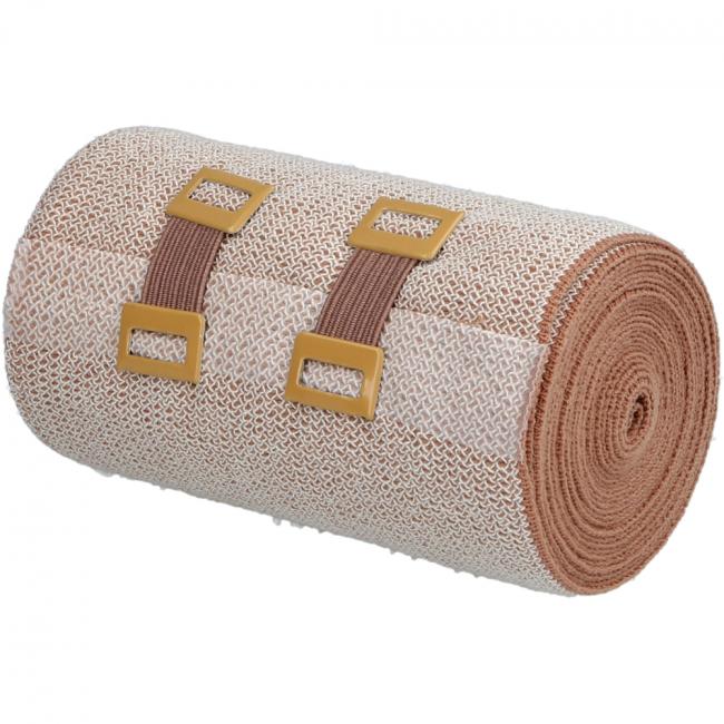 Hautfarbene Binde aus reiner Baumwolle, Dehnung ca. 80%, textilelastisch, atmungsaktiv, hautfreundlich, latexfreie Endfixierung, mit Verbandklammern.