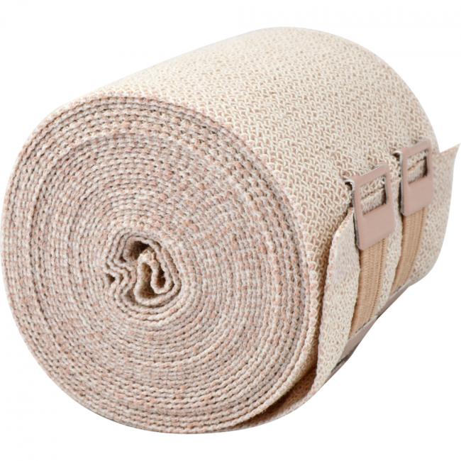 Hautfarbene Binde aus reiner Baumwolle, Dehnung ca. 80%, textilelastisch, atmungsaktiv, hautfreundlich, latexfreie Endfixierung, mit Verbandklammern.