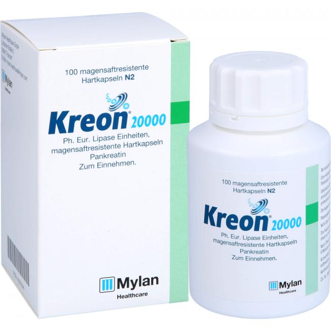 Der Wirkstoff in Kreon 20000 ist Pankreatin. Eine Kreon 20000 Kapsel enthält 300 mg Pankreatin, entsprechend (Ph. Eur.-Einheiten). Lipolytische Aktivität 20.000, amylolytische Aktivität 16.000 und proteolytische Aktivität 1.200. Die sonstigen Bestandteile sind: