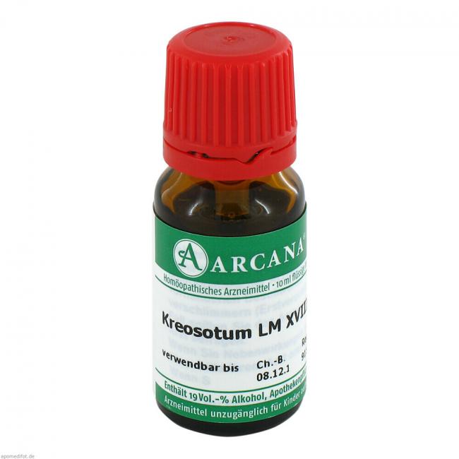 Kreosotum LM XVIII . Anwendungsgebiete: Registriertes homöopathisches Arzneimittel, daher ohne Angabe einer therapeutischen Indikation. Warnhinweis: Enthält 19 Vol.-% Alkohol.