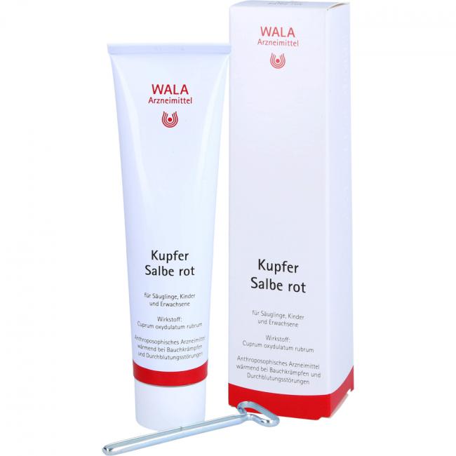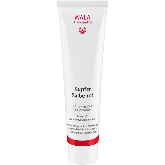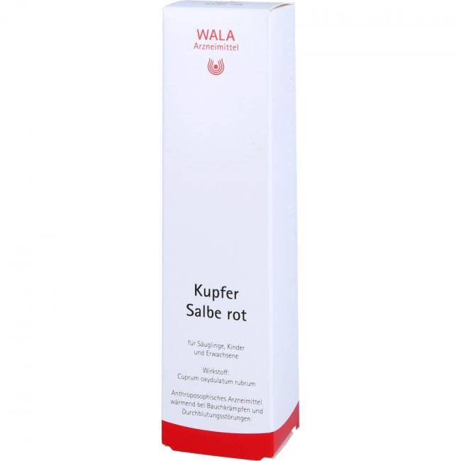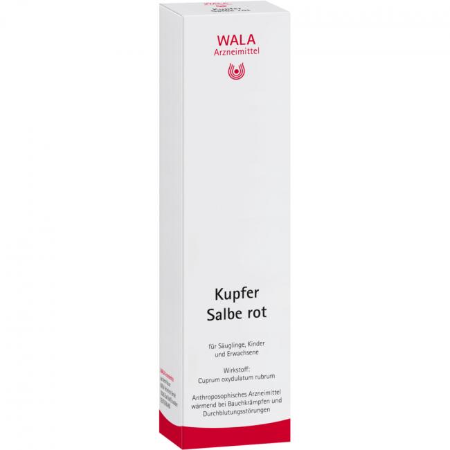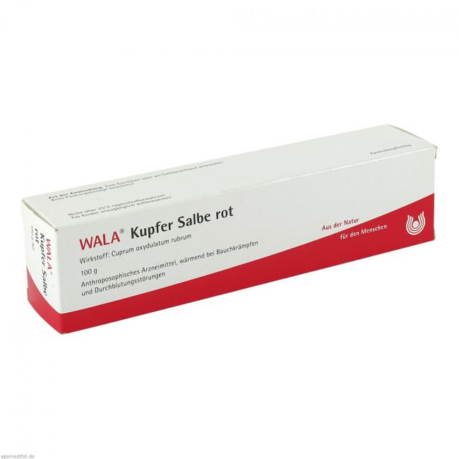 Kupfer Salbe rot. Wirkstoff: Cuprum oxydulatum rubrum. Anwendungsgebiete: Gemäß der anthroposophischen Menschen- und Naturerkenntnis. Dazu gehören: Harmonisierung von Integrationsstörungen des Wärmeorganismus im Kreislauf- und Stoffwechsel-Bewegungs-System, z.B. bei peripheren und venös hypostatischen Durchblutungsstörungen, krampfartigen Beschwerden des Magen-Darm-Traktes, Nierenfunktionsstörungen.