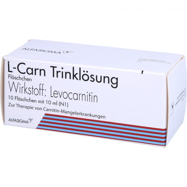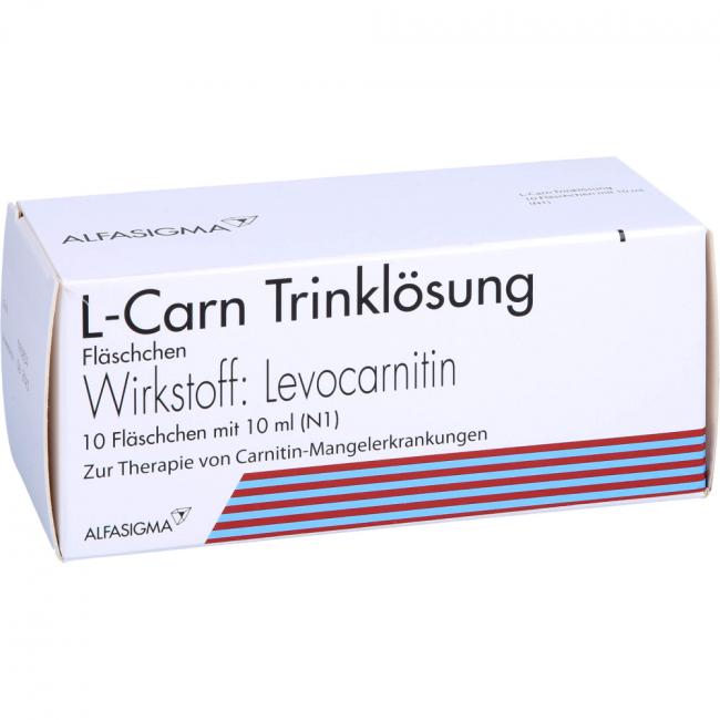 L-Carn Trinklösung. Wirkstoff: 1 g Levocarnitin/10 ml Lösung. Anwendungsgebiete: Zur Therapie von Carnitinmangelerkrankungen (Levocarnitin-Substitutionstherapie) angewendet: Zum Ausgleich von Levocarnitin-Verlusten durch Defekte des sog. Carnitin-Transporters in der Zellmembran (Substitution bei primärem systemischen Carnitinmangel). Zum Ausgleich von Levocarnitin-Verlusten, welche durch verschiedene Erkrankungen und als Nebenwirkungen bestimmter Behandlungsarten hervorgerufen sein können (Substitution bei sekundärem systemischen Carnitinmangel). Zum Ausgleich von behandlungsbedingten Levocarnitin-Verlusten, welche als Folge einer Dauerbehandlung durch Blutwäsche bei Patienten mit Nierenversagen entstehen können (Substitution dialysebedingter Levocarnitin-Verluste bei chronischer Hämodialyse, d.h. als Folge eines sekundären Levocarnitin-Mangels). Als Behandlungsversuch bei Sonderformen von Muskelschwunderkrankung mit begleitender Muskelverfettung, welche durch einen Levocarnitin-Mangel der Muskulatur bedingt sind (Muskeldystrophie mit Lipidakkumulation, die auf einem primären muskulären Levocarnitin-Mangel beruht).