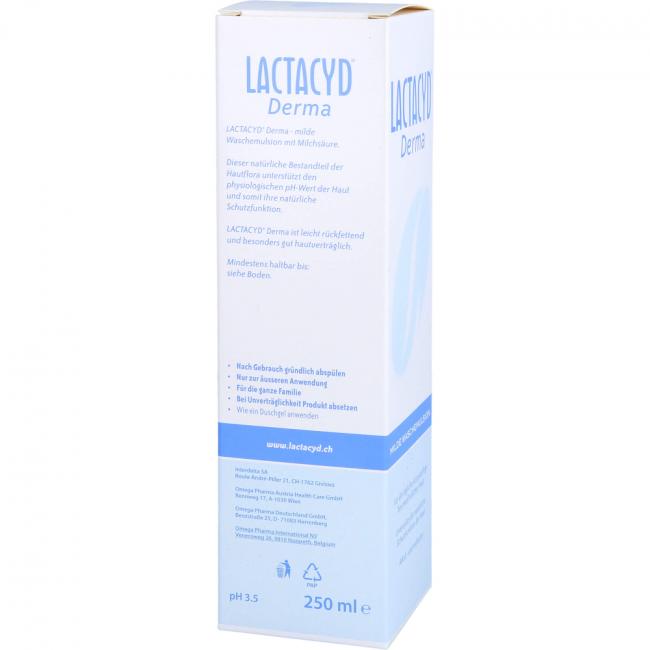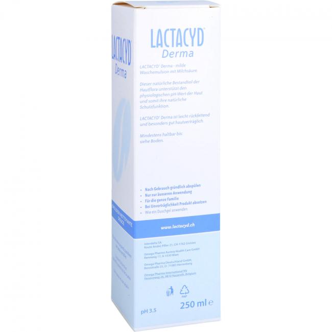 - Lactacyd Derma unterstützt den physiologischen pH–Wert der Haut. Der natürliche Säureschutzmantel bleibt erhalten und unterstützt so die natürliche Schutzfunktion der Haut.