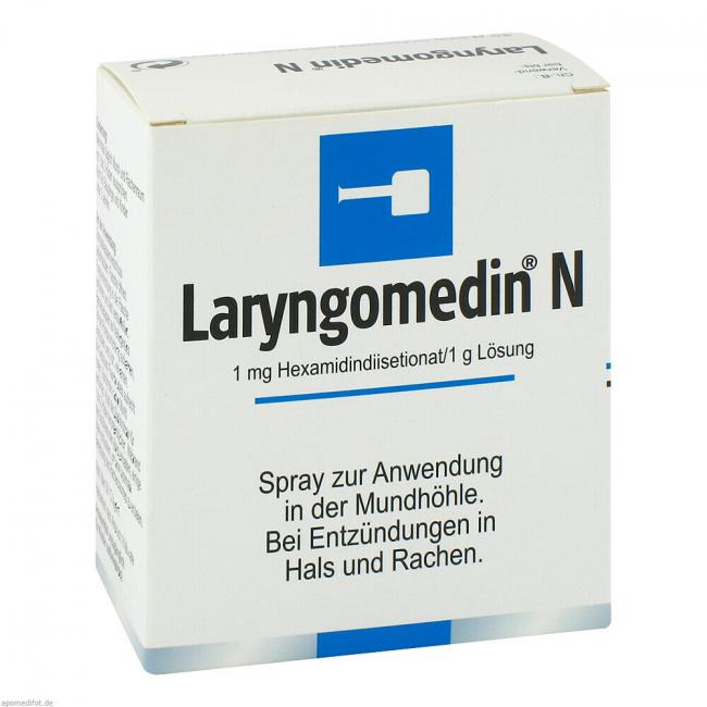 Laryngomedin N Spray. Wirkstoff: Hexamidindiisetionat. Anwendungsgebiete: zur unterstützenden Behandlung von bakteriellen Entzündungen der Schleimhaut von Mund und Rachen. Warnhinweis: Enthält 1 Vol.-% Alkohol!