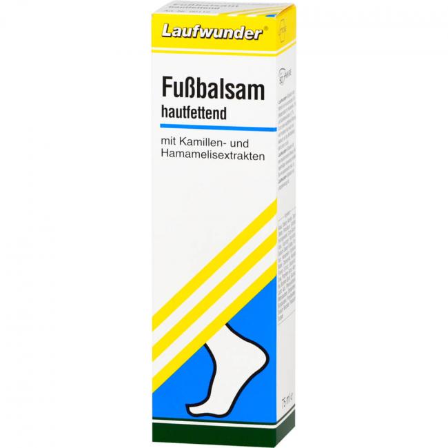 Laufwunder-Fußbalsam hautfettend ist ein kosmetisches Fußpflegeprodukt mit Hamamelis- (1%) und Kamillenextrakten (0,7%). Durch seine hautfettende Wirkung wird trockene Haut weich und elastisch und das Wohlbefinden kehrt sofort zurück. Laufwunder-Fußbalsam hat eine desodorierende Wirkung. Bei regelmäßiger Anwendung erhalten Sie eine seidenweiche Haut, da Laufwunder-Fußbalsam eine Langzeitwirkung hat.