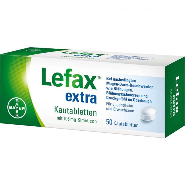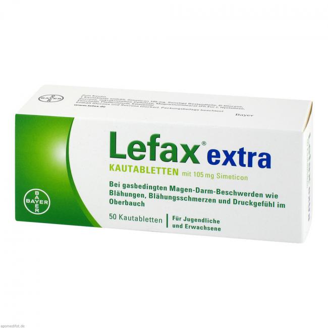 Lefax Extra Kautabletten. Wirkstoff: Simeticon. Anwendungsgebiet: zur symptomatischen Behandlung von gasbedingten Magen-Darm-Beschwerden (Meteorismus), z.B. Blähungen, Blähungsschmerzen, Spannungsgefühl und verstärkter Gasbildung nach Operationen, bei funktionellen Beschwerden des oberen Magen-Darm-Traktes (funktionelle Dyspepsie) wie Völlegefühl, Schmerzen/ Druckgefühl im Oberbauch, Aufstoßen, Übelkeit vorzeitiges Sättigungsgefühl, Brechreiz und zur Vorbereitung diagnostischer Untersuchungen im Bauchbereich zur Reduzierung von Gasschatten (Sonographie, Röntgen).