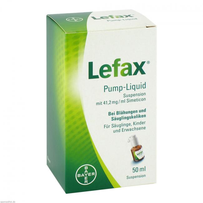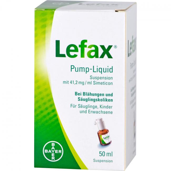 Lefax Pump-Liquid Suspension. Wirkstoff: Simeticon. Anwendungsgebiete: bei übermäßiger Gasbildung und Gasansammlung im Magen-Darm-Bereich (Meteorismus) mit gastrointestinalen Beschwerden wie Blähungen, Völlegefühl und Spannungsgefühl im Oberbauch, zur symptomatischen Behandlung bei Säuglingskolik (3-Monats-Kolik), bei verstärkter Gasbildung nach Operationen, zur Vorbereitung diagnostischer Untersuchungen im Bauchbereich zur Reduzierung von Gasschatten (Sonographie, Röntgen) und als Sofortmaßnahme bei Verschlucken von und Vergiftungen mit Flüssigseifen (Tensiden).