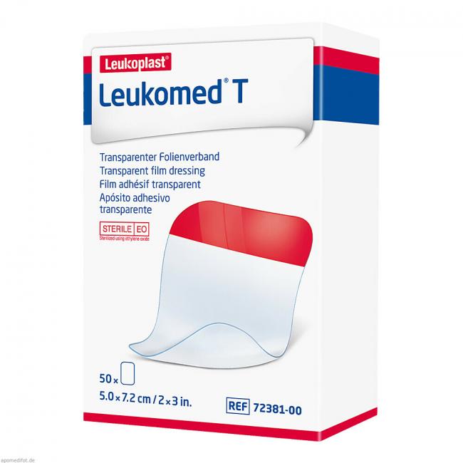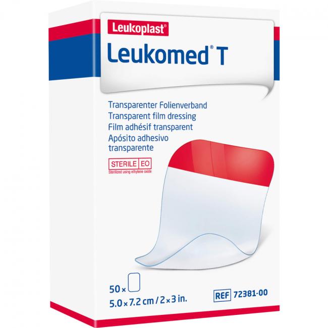 Ein Wundverband, zwei Anwendungen: Leukomed T fixiert einerseits Katheter, Kanülen, Wundauflagen sowie medizinische Hilfsmittel wasser- und keimdicht. Andererseits werden nicht mehr sezernierende Wunden vor Reibung und Scherkräften geschützt. Hierdurch können auch dekubitusgefährdete Hautstellen entlastet werden. Durch die hohe Wasserdampfdurchlässigkeit der Folie werden Feuchtigkeitsansammlungen verhindert und das Risiko von Mazerationen reduziert. Die hochflexible, wasserdichte Folie bietet einen sehr hohen Tragekomfort und sitzt auch an Gelenken und Extremitäten wie eine zweite Haut. Leukomed T ist steril und stellt einen zuverlässigen Schutz gegen Bakterien und Viren dar. Die abgerundeten Ecken gewährleisten eine sichere Fixierung. Die Transparenz ermöglicht eine kontinuierliche Inspektion der Wunde oder Fixierung. Das intuitive Applikationssystem mit dem roten Streifen gewährleistet eine unkomplizierte, schnelle Anwendung, auch mit Handschuhen. Leukomed T besteht aus einer transparenten und extradünnen Polyurethanfolie, vollflächig beschichtet mit Polyacrylatkleber.