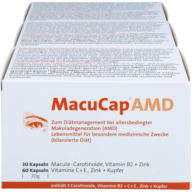 MacuCap AMD - Kapsel - Carotinoide + Vitamin B2 + Zink: Sojaöl, Gelatine, lutein- und zeaxanthinhaltiger Extrakt aus Studentenblumen (Trägerstoff: Sonnenblumenöl, Safloröl, Emulgator: Sonnenblumen-Lecithin, Antioxidationsmittel: Tocopherol), Feuchthaltemittel: Glycerin, Sorbit, Emulgator: Glycerolmonostearat, Soja-Lecithine, Zinkoxid, Riboflavin (Vitamin B2), Farbstoffe: Eisenoxide und -hydroxide. MacuCap-Kapsel - Vitamine + Mineralien: Ascorbinsäure, D-alpha-Tocopherol, Gelatine, pflanzliche Öle und Fette (Palm, Raps), Feuchthaltemittel: Glycerin, Sorbit, Lecithin (Sonnenblumen), Zinkoxid, Kupfergluconat, Farbstoffe: Eisenoxide und -hydroxide. Allergene: Soja