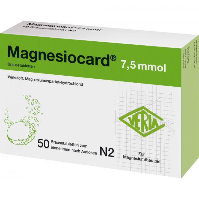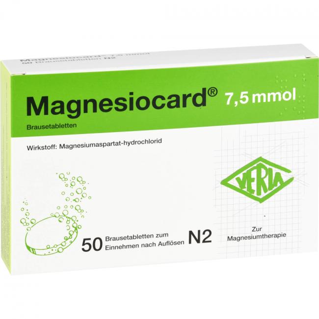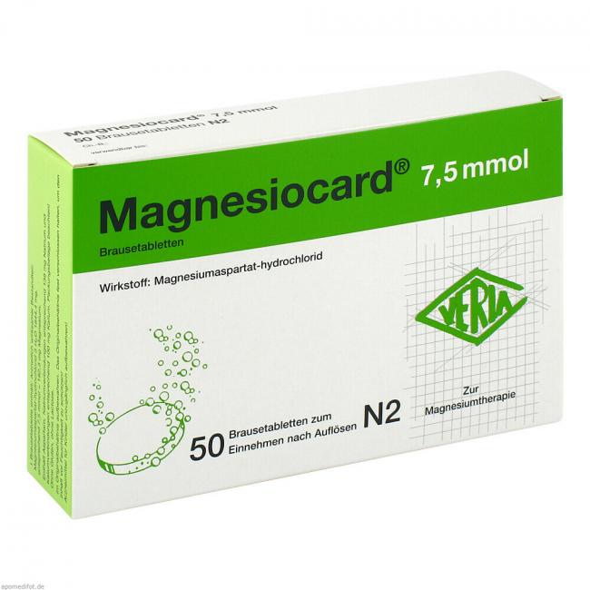 Magnesiocard 7,5 mmol. Wirkstoff: Magnesiumaspartat-hydrochlorid. Anwendungsgebiete: Behandlung von therapiebedürftigen Magnesium-Mangelzuständen, die keiner Injektion/Infusion bedürfen. Nachgewiesener Magnesiummangel, wenn er Ursache für Störungen der Muskeltätigkeit (neuromuskuläre Störungen, Wadenkrämpfe) ist. Hinweise: enthält Aspartam, Natrium- und Kaliumverbindungen.