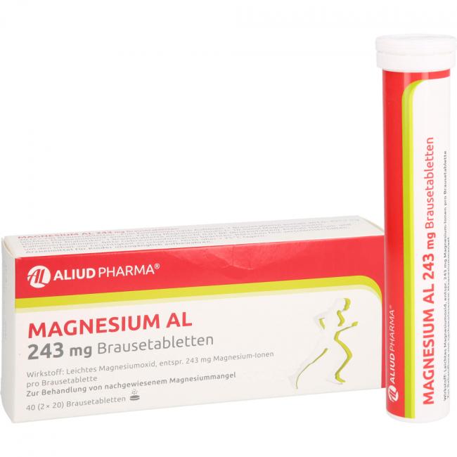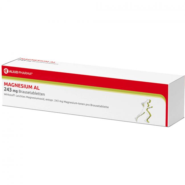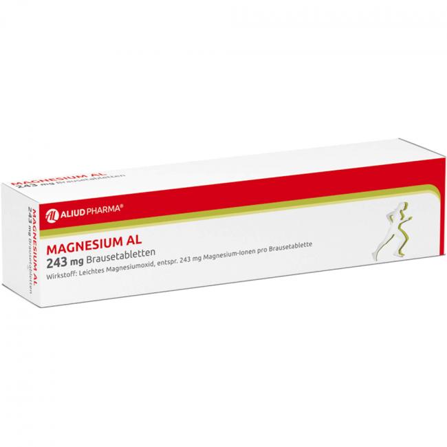 Magnesium AL 243 mg Brausetabletten Wirkstoff: Leichtes Magnesiumoxid, entspr. 243 mg (10 mmol) Magnesium-Ionen pro Brausetablette. Anwendungsgebiete: bei nachgewiesenem Magnesiummangel, wenn er Ursache für Störungen der Muskeltätigkeit (neuromuskuläre Störungen, Wadenkrämpfe) ist.