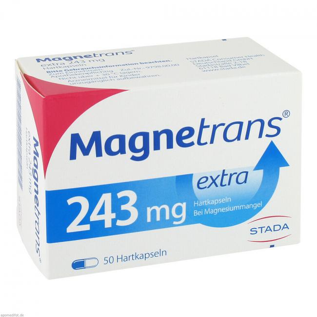 Magnetrans extra 243 mg Hartkapseln. Wirkstoff: Schweres Magnesiumoxid. Anwendungsgebiete: bei nachgewiesenem Magnesiummangel, wenn er Ursache für Störungen der Muskeltätigkeit (neuromuskuläre Störungen, Wadenkrämpfe) ist.