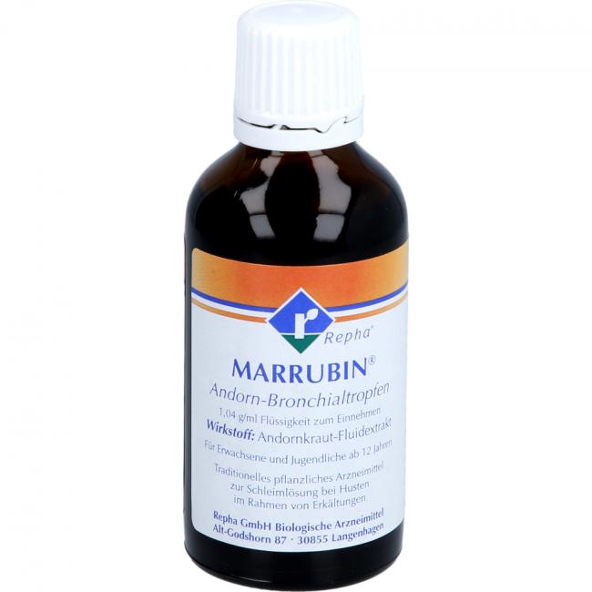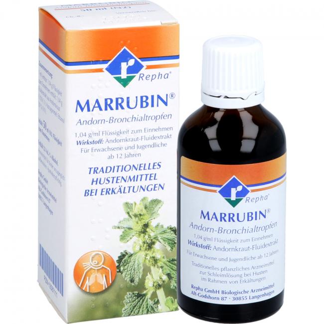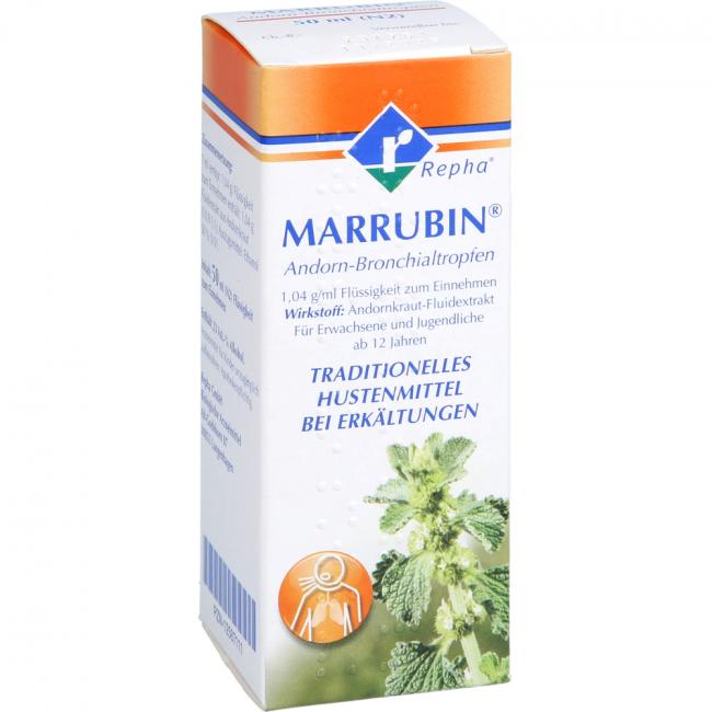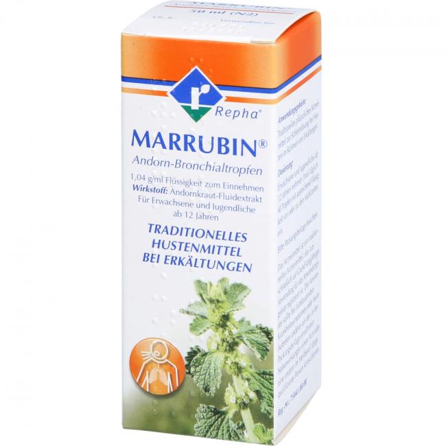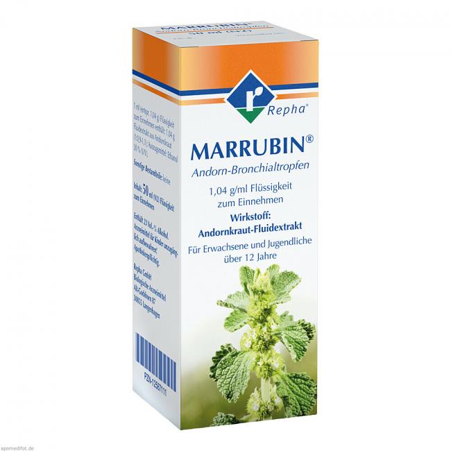 Marrubin Andorn-Bronchialtropfen. Wirkstoff: Andornkraut-Fluidextrakt. Anwendungsgebiete: Traditionelles pflanzliches Arzneimittel zur Schleimlösung bei Husten im Rahmen von Erkältungen ausschließlich aufgrund langjähriger Anwendung. Warnhinweis: Enthält 23 Vol.-% Alkohol!