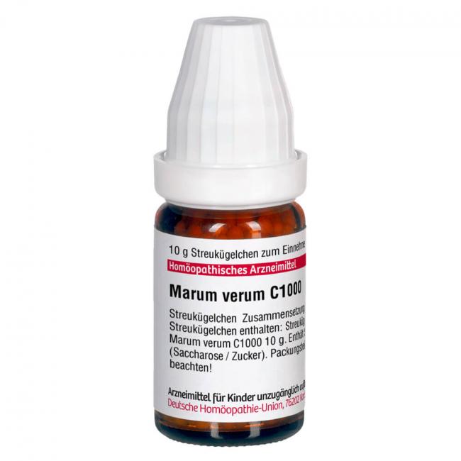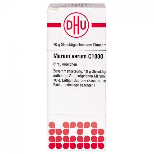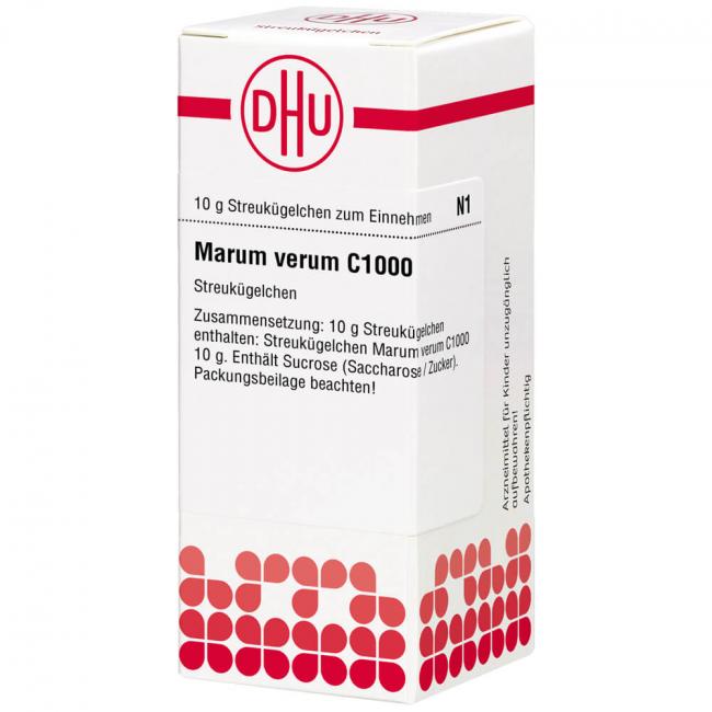 Marum verum C 1000. Anwendungsgebiete: Registriertes homöopathisches Arzneimittel, daher ohne Angabe einer therapeutischen Indikation. Warnhinweis: Dieses Arzneimittel enthält Sucrose (Saccharose / Zucker).