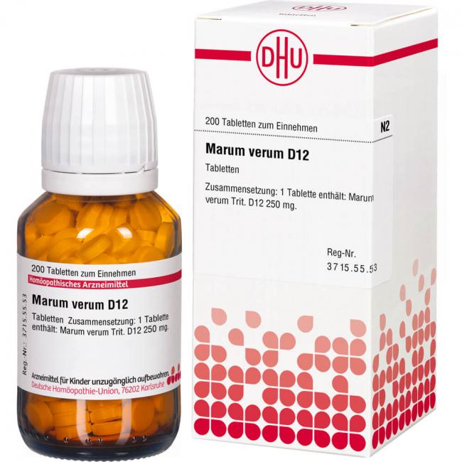 Marum Verum D 12. Anwendungsgebiete: Registriertes homöopathisches Arzneimittel daher ohne Angabe einer therapeutischen Indikation. Warnhinweis: Enthält Lactose (Milchzucker) und Weizenstärke.