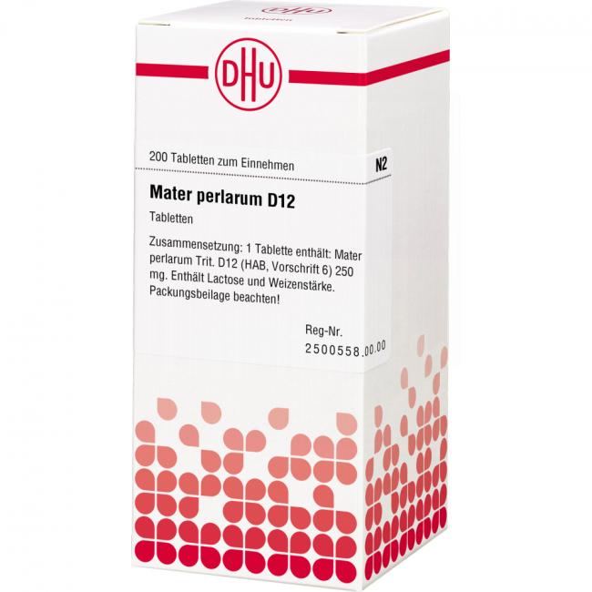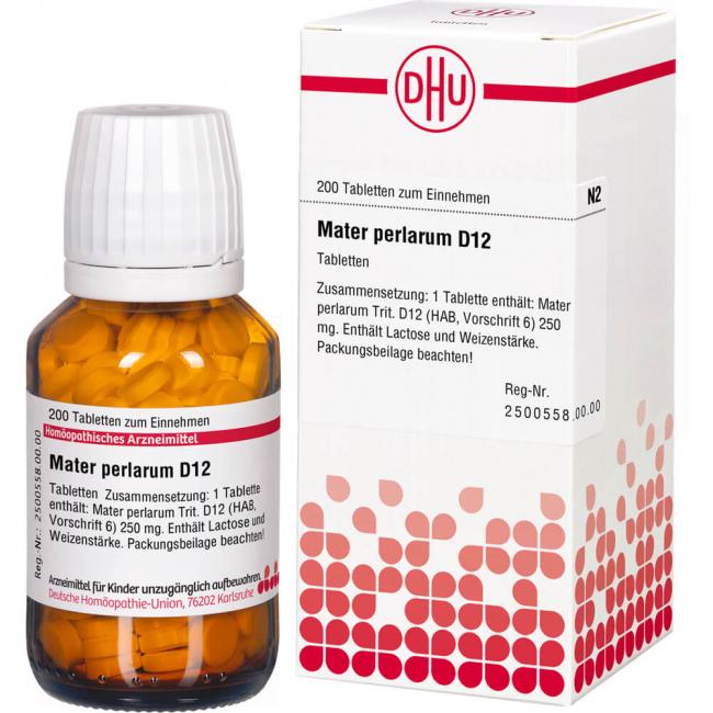 Mater Perlarum D 12. Anwendungsgebiete: Registriertes homöopathisches Arzneimittel daher ohne Angabe einer therapeutischen Indikation. Warnhinweis: Enthält Lactose (Milchzucker) und Weizenstärke.