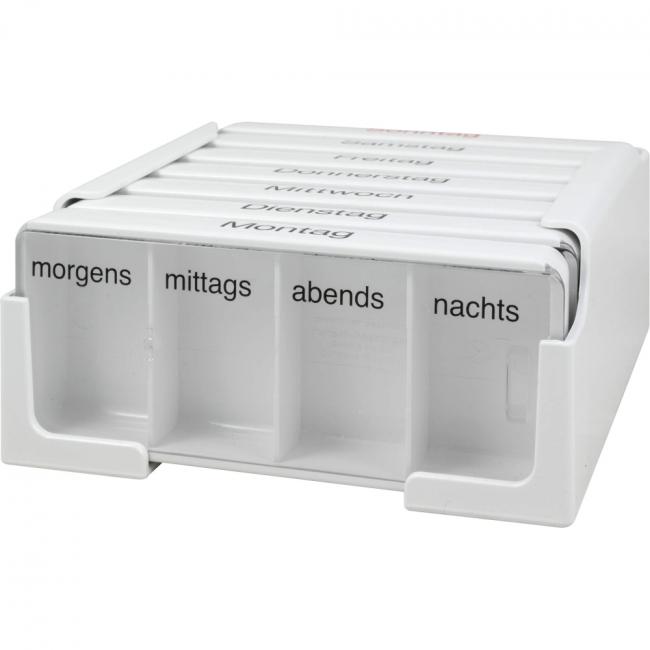 Die zuverlässige Hilfe für alle Menschen, die regelmäßig mehrmals täglich Arzneimittel einnehmen müssen. Dient der Arzneimittelsicherheit und kontrolliert die richtige Einnahme der vom Arzt verordneten Medikamente. Übersichtlich und einfach in der Handhabung. Die großen Einzelfächer bieten genügend Platz zur Aufnahme von mehreren Medikamenten. Die Tagesdosen können separat mitgenommen werden. Aus hochwertigem und langlebigem ABS-Kunststoff hergestellt. Jahrelang bewährt im ambulanten und stationären Einsatz. Keine scharfen Kanten oder Ecken.
