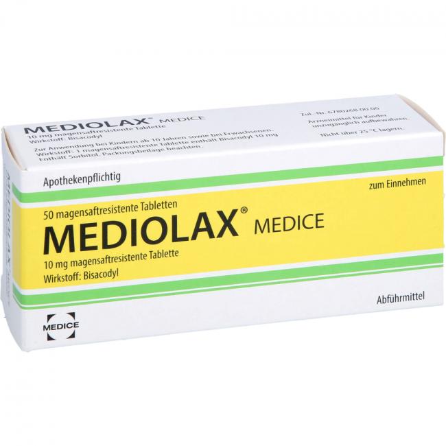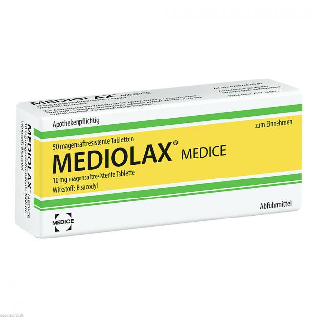 Mediolax Medice, 10 mg magensaftresistente Tabletten. Wirkstoff: Bisacodyl. Anwendungsgebiete: Zur kurzfristigen Anwendung bei Obstipation; bei Erkrankungen, die eine erleichterte Defäkation erfordern. Zur Anwendung bei Kindern ab 10 Jahren sowie bei Erwachsenen.