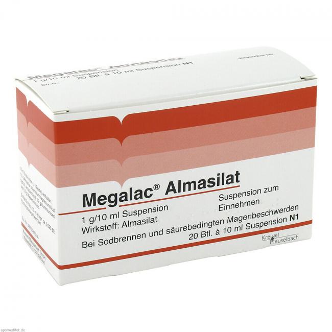 Megalac Almasilat 1 g/10 ml Suspension. Wirkstoff: Almasilat. Anwendungsgebiete: zur symptomatischen Behandlung von Erkrankungen, bei denen die Magensäure gebunden werden soll: Magen- und Zwölffingerdarmgeschwüre, Sodbrennen und säurebedingte Magenbeschwerden.