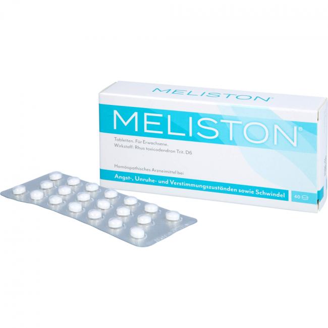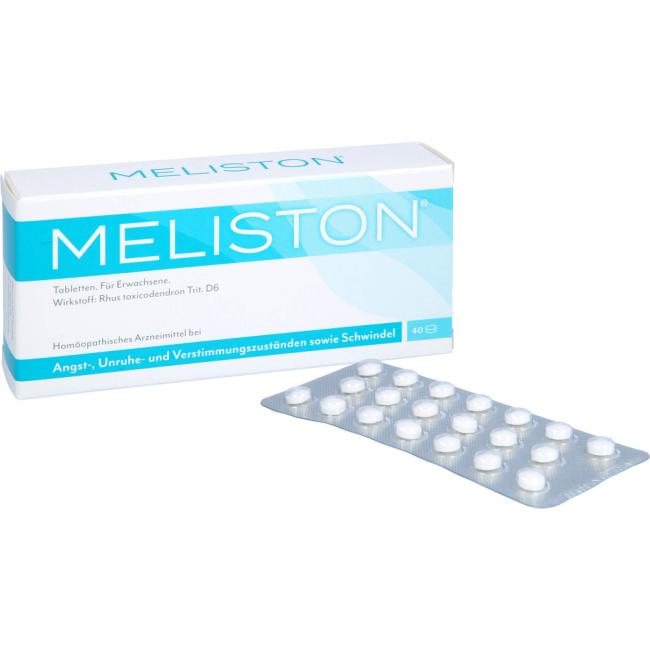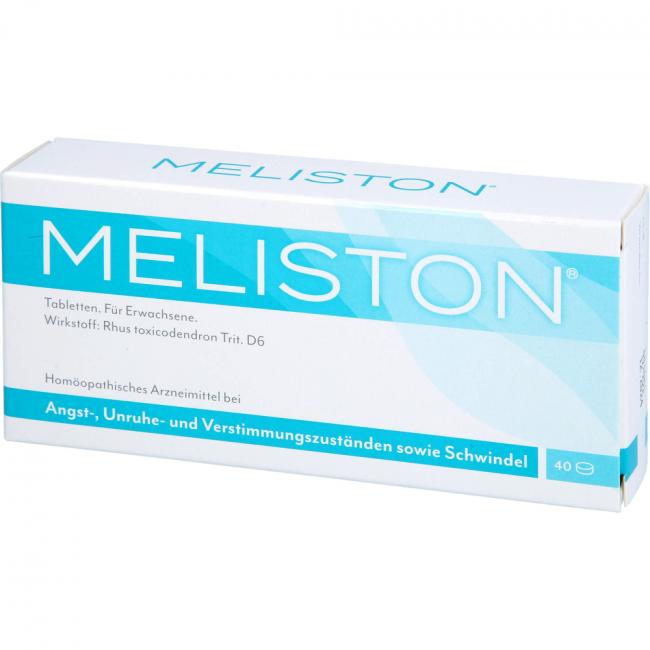 Meliston Tabletten. Wirkstoff: Rhus toxicodendron Trit. D6. Anwendungsgebiete: Meliston wird angewendet entsprechend dem homöopathischen Arzneimittelbild. Dazu gehören: Angst-, Unruhe- und Verstimmungszustände; Schwindel. Warnhinweis: Enthält Lactose