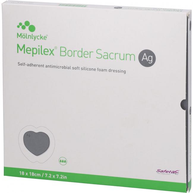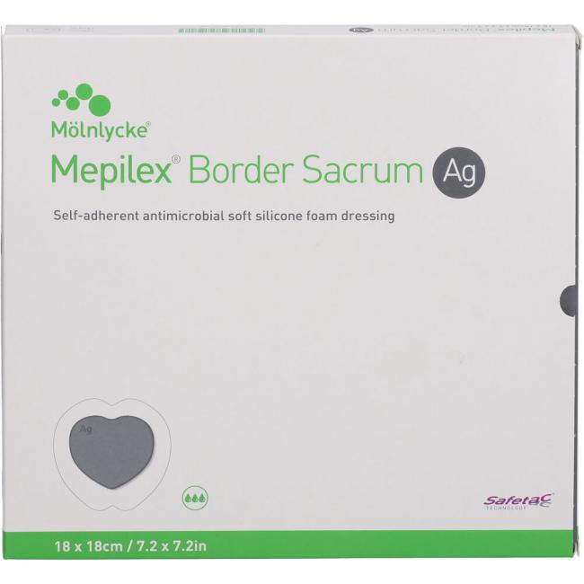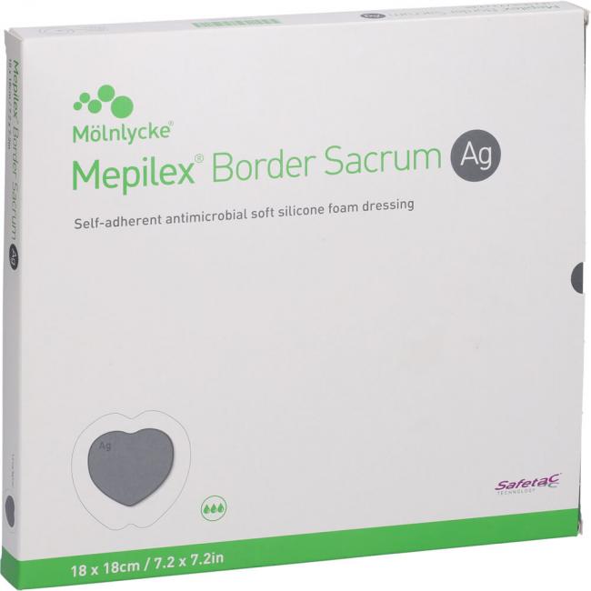 Mepilex Border Sacrum Ag ist für die Behandlung von mäßig bis stark exsudierenden Wunden im Sakralbereich indiziert - bei denen eine feuchte Wundumgebung, Exsudatmanagement, eine sanfte Fixierung sowie eine antimikrobielle Wirksamkeit erforderlich sind. Mepilex Border Sacrum Ag kann bei Behandlung und Überwachung durch eine qualifizierte medizinische Fachkraft auf infektiösen Wunden verwendet werden.