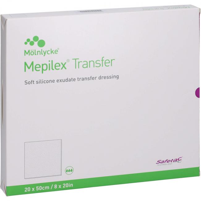 Mepilex Transfer wurde für leicht bis sehr stark exsudierende und schwer zu versorgende Wunden entwickelt. Die Wundauflage kann auch alleine als Schutzschicht auf nicht exsudierenden Wunden und/oder großen Bereichen fragiler Haut verwendet werden. In Kombination mit einem Sekundärverband leitet Mepilex Transfer das Exsudat von der Wunde ab und ermöglicht einen Abfluss in den Sekundärverband z.B. einer Kompresse wie Mextra Superabsorbent. Mepilex Transfer kann mehrere Tage auf der Wunde liegen bleiben, so dass nur der Sekundärverband gewechselt werden muss.